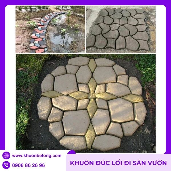 Khuôn đúc lối đi thường có kích thước phổ biến 43x43cm hoặc lớn hơn, với hoa văn đá rối bất quy tắc để tạo cảm giác tự nhiên khi ghép nối. Các ô đá riêng lẻ được phân cách bởi rãnh sâu 4cm, cho phép bê tông lấp đầy mà vẫn giữ khoảng cách thoát nước tự nhiên, tránh đọng nước mưa.