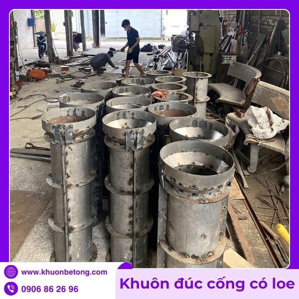 Khác với khuôn cống thẳng thông thường, khuôn có phần loe được thiết kế với miệng ngoài mở rộng dần theo góc độ chính xác (thường từ 3-8 độ tùy loại), tạo nên đầu âm hình loe và đầu dương thẳng để lắp ghép chồng mí. Phần thân khuôn sử dụng thép tấm dày từ 8-16mm được cuộn tròn và hàn kín khít, kết hợp hệ thống gia cố bằng thép hình V hoặc U chạy dọc để chống biến dạng dưới áp lực bê tông rung ép hoặc rung lõi.