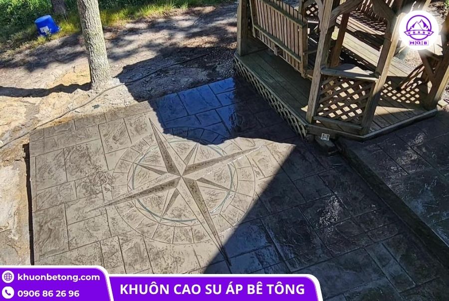 Sau khi lớp bê tông được đổ và phẳng, người thợ sử dụng khuôn cao su áp mạnh lên bề mặt khi bê tông còn ẩm. Lúc này, khuôn truyền toàn bộ hoa văn xuống nền, tạo thành lớp bê tông có họa tiết tự nhiên và bền vững theo thời gian.